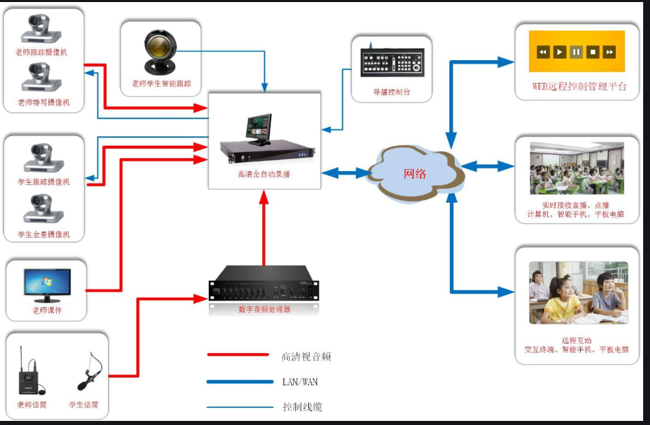 錄播系統是把現場攝錄的視頻、音頻、電子設備的圖像信號(包含電腦、視頻展臺等)進行整合同步錄制,生成標準化的流媒體文件,用來對外直播、存儲、后期編輯、點播。學生或者老師可以從不同的攝像機視角觀看錄像文件。同時也可以對網上的信息源進行整理上傳,達到充分利用網絡學習資源的目的。