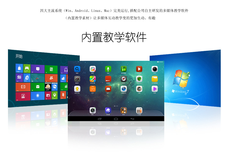 集成了電子白板、平板電視、電腦、投影機(jī)、投影幕布、音響、廣告機(jī)、WINI等多種功能為一體的互動(dòng)教學(xué)機(jī),從而增強(qiáng)了教學(xué)互動(dòng)性,使教學(xué)更簡(jiǎn)潔、更簡(jiǎn)易、更高效。