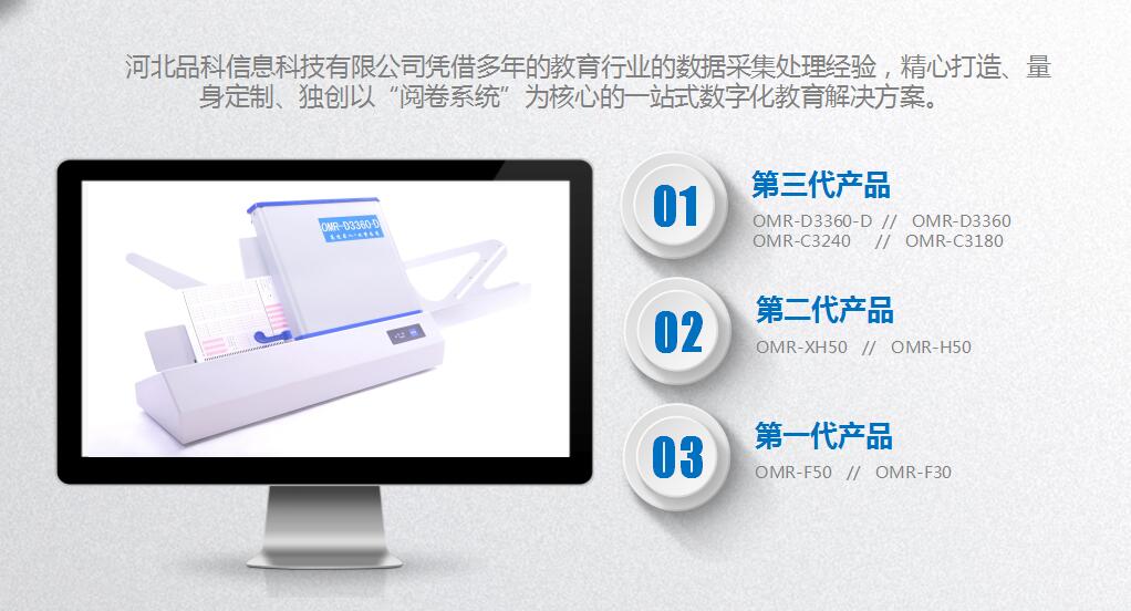 品科是一家極富創(chuàng)新的教育科技產(chǎn)品公司。作為全國(guó)第 1大光標(biāo)閱讀機(jī)廠商,品科科為全國(guó)用戶提供高考網(wǎng)上閱卷系統(tǒng)、多功能光標(biāo)閱讀機(jī)、外包型閱卷服務(wù)以及包括答題卡、智能軟件定制服務(wù)。